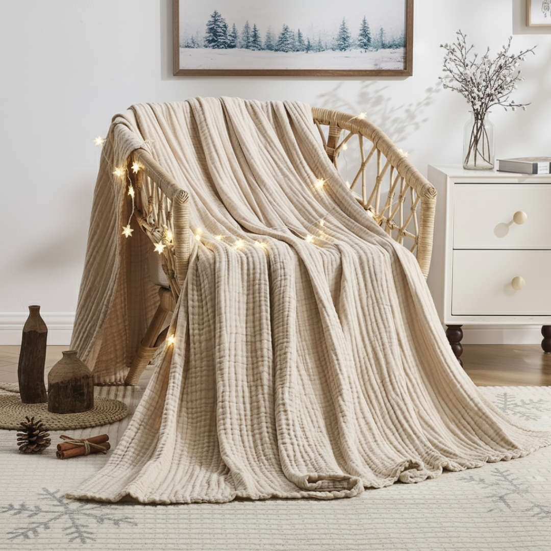 The Winter Muslin Blanket delivers soft, breathable warmth from the first touch, thanks to its premium layered 100 % cotton muslin weave. This time-tested fabric holds gentle heat while allowing natural airflow for perfectly balanced comfort on cold nights and cozy relaxation all season long.